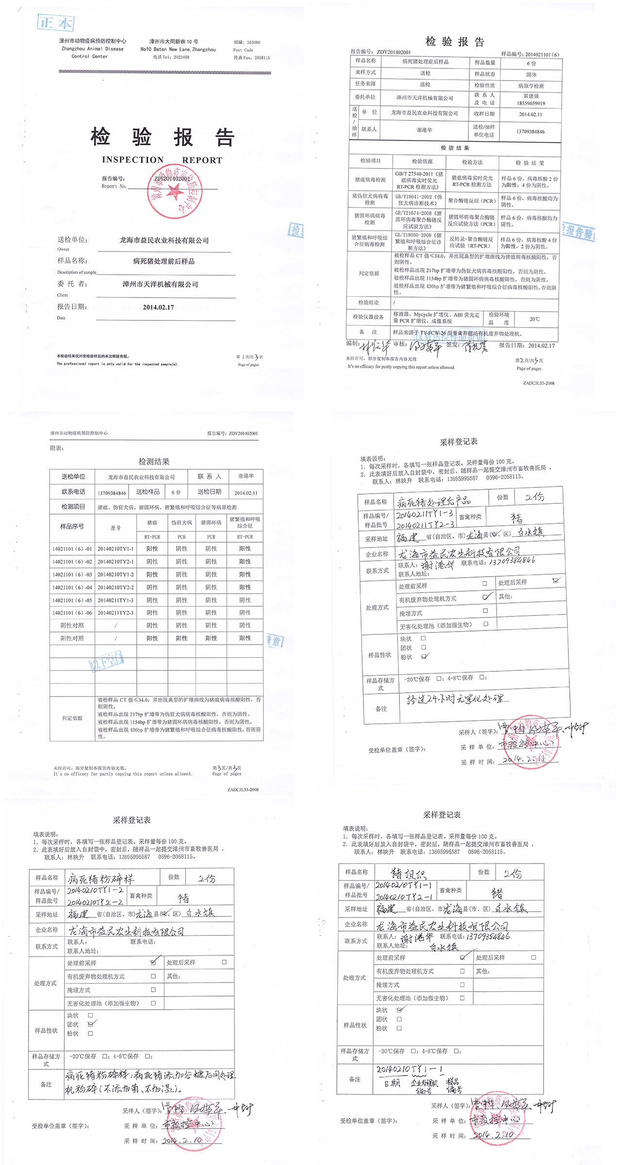 漳州市動(dòng)物疫病預(yù)防控制中心檢驗(yàn)報(bào)告--病死豬處理前后樣品